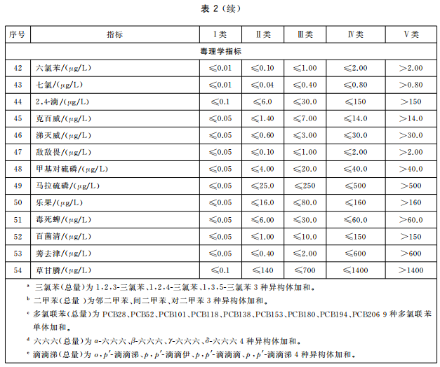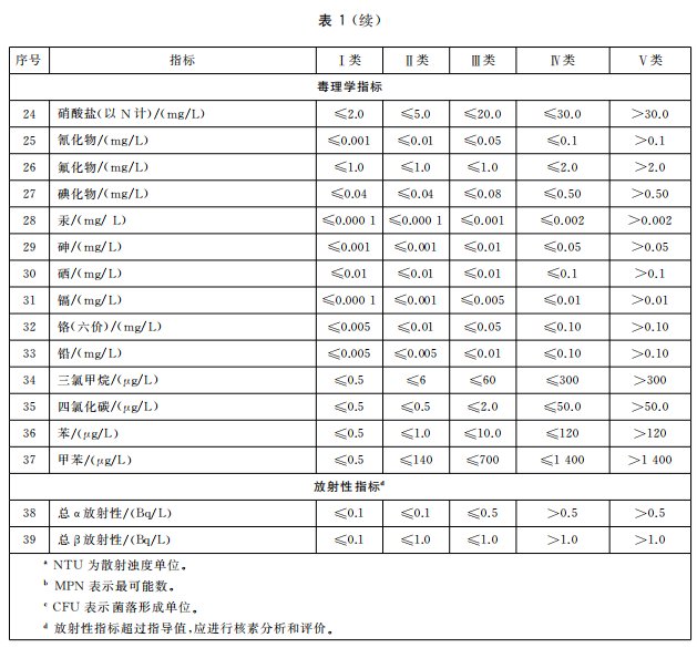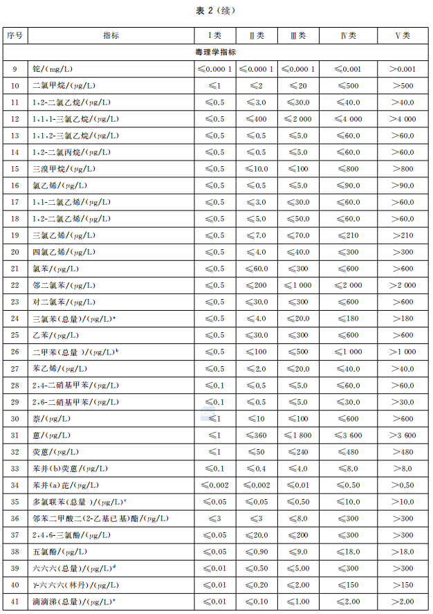 依据我国地下水质量状况和人体健康风险,参照生活饮用水、工业、农业等用水质量要求,依据各组分含量高低(PH除外),分为五类。