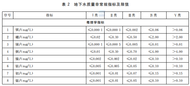 地下水质量指标分为常规指标和非常规指标,其分类及限值分别见表1和表2。